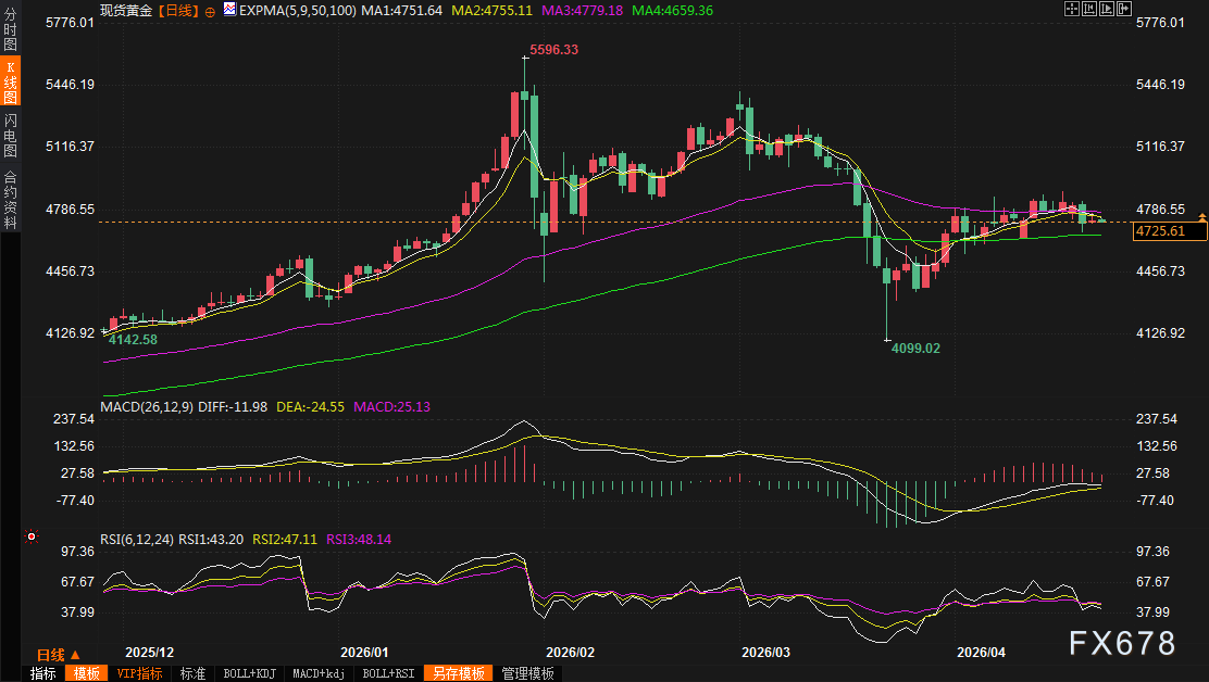 汇通财经APP讯——现货黄金周三(4月22日)反弹受阻。尽管特朗普单方面宣布延长停火期限,且有消息称美国可能开放对伊朗的封锁,市场一度燃起乐观情绪,推动金价快速反弹至4772美元附近。然而,伊朗革命卫队随即在霍尔木兹海峡扣押两艘船只,这一“示强”举动瞬间点燃中东地缘紧张的火药桶。国际油价重拾涨势并突破100美元大关,通胀预期与全球央行加息压力同步升温,美元指数强势反弹,最终令金价回吐全部涨幅,收盘报4740美元/盎司附近,全天涨幅仅约0.4%。进入周四(4月23日)亚市早盘,金价继续震荡微跌,目前交投于4725美元附近,下跌约0.3%。这场看似短暂的反弹,再次凸显出黄金在当前复杂宏观与地缘环境中进退两难的尴尬处境。