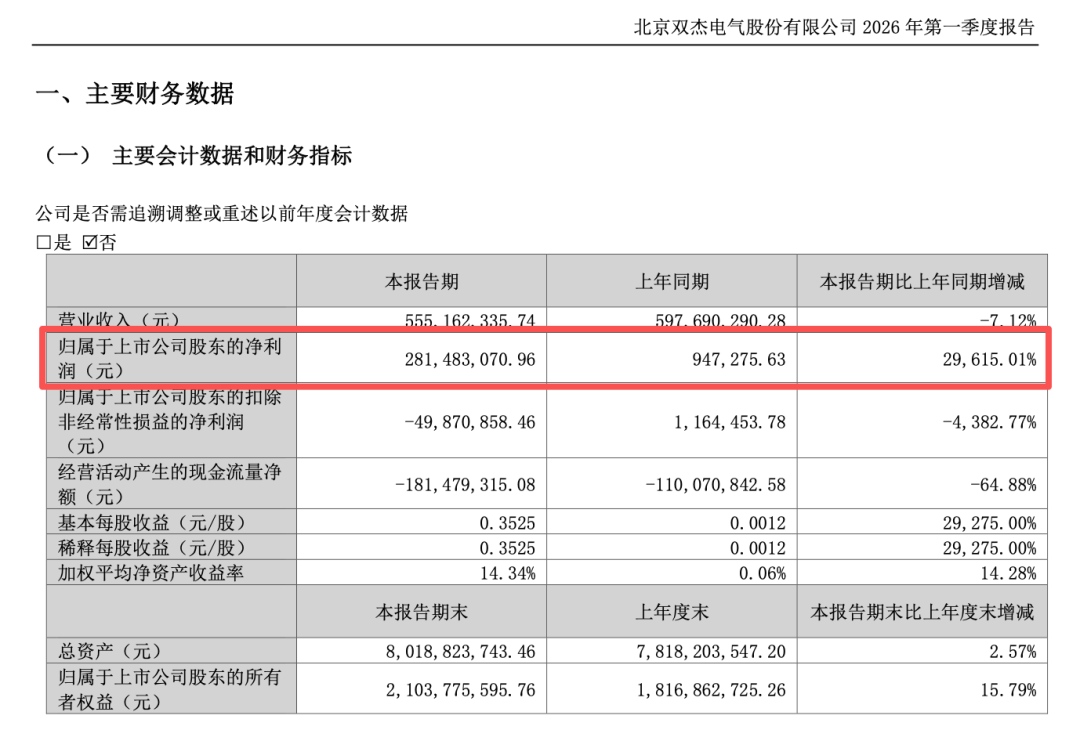 4月23日晚间,双杰电气披露2026年一季报显示,期内公司实现营业收入5.55亿元,同比下滑7.12%;归母净利润2.81亿元,同比大幅增长29615.01%;扣非净利润亏损4987.09万元,由盈转亏。