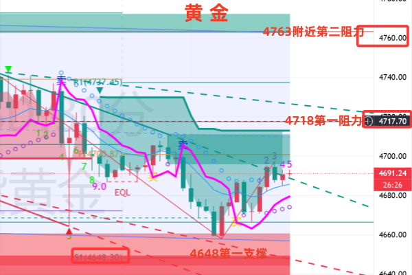 技术面:从技术面来看,日线级别上,黄金在触及阶段高点后出现回调,价格跌破短期均线支撑,趋势由强势转为震荡偏弱。当前下方关键支撑位位于4650美元附近,若跌破可能进一步测试4600美元区域;上方阻力位则位于4720-4770美元区间。动能指标显示多头动能减弱,但尚未进入深度超卖区域。4小时级别来看,金价处于短期下降通道内运行,反弹力度有限,若无法重新站上4718美元上方,短期仍存在进一步回调风险;若突破阻力区间,则可能重启上行走势。晚间重点关注上方4718/4763美元一线压力,下方关注4648/4611美元一线支撑。